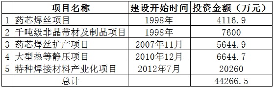1、药芯焊丝项目主要生产碳钢药芯焊丝、不锈钢药芯焊丝和堆焊材料等。药芯焊丝扩产项目已2008年底全面投产,年生产能力超过2万吨,是目前国内最大的药芯焊丝生产企业之一,产品已通过十国船级社的认证。
